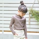 やはりどちらのサイズも袖が長めなので折り返して着ています。伸びの良い生地なので、細身のお子さまでしたらジャストサイズか、ワンサイズ下でもいいかもしれません。