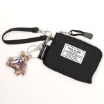 黒のシンプルなデザインで熊のプラスチックチャームがついたかわいいデザイン。ジッパーを開けると中は黄色地に熊の模様。