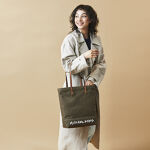 使いやすいしっかりした生地!落ち着いたお洒落カーキー色に茶色レザーハンドルがいい感じでした!
