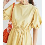 ウエストで絞れるのが良いです。程よく長い丈なので、しゃがんだりしてもおしりが気にならなさそう。イエローが売り切れだったのでピンクにしましたが、このくすみ具合ならピンクの方が大人っぽく着られそうです。ちょっとだけ肩の糸がほつれてましたが許容範囲です。