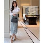 こんなプチプラとは思えないくらい上品でキレイなシルエット。通常S-Mのどちらかを購入していますが、Sでも余裕だったので、細身の方だとゆるいかも?後ろがゴムなので、楽ですが多少余る感じがしました。