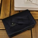 柔らかい手ざわりでリボンのデザインも素敵です。カードがたくさん入るので、今まで使っていた長財布の中身がほとんど収納できました。色は赤っぽいオレンジ。コーラルという色は心の平穏という意味の文化もあるそうです。バックに入れていても見つけやすいので便利です。とても気に入っていて長く使えそうです。