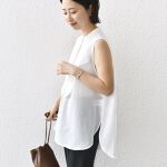 ワンサイズだったので少し不安でした。大きいサイズのものをダボッと着るのは低身長のため似合わないので、きっちり着用できるようなものを探していました。後ろ側はゆとりあるように見えますが、前側はわりとスマートな感じに見えます。明るい上品な紺色です。脇周りが大きいのでインナーが見えるので、気になるようなら、羽織ものが必要かもしれません。
