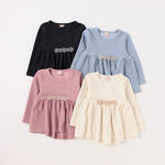 冬には少し薄手の生地ですが、ストレッチで着やすそうです。カラーも落ち着いた色ですし、後ろ丈が長くなっているのもお話のワンポイントも可愛いです。