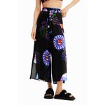 デシグアルの製品はスペインのもので、サイズは大き目になるだろうということは過去に購入した製品で承知をしていました。丈は、裾が床に付くかつかないか位なので、少し裾上げして、座った時にスリットが太ももの所まで割れないようにホックを付けて普段使いも出来るようにして使用し、近所の買い物にも着用してます。