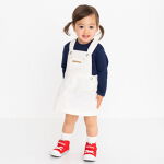 シンプルながら、形が綺麗でずっとほしいと思っていたジャンパースカートです。まだだいぶ大きいですが、肩を自由に調整できるので、長くきれそうです。