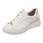 本モデルは、白を基調にゴールドのアクセントを効かせた上品なデザインが印象的で、スニーカーでありながら洗練された印象を与える。カジュアルスタイルはもちろん、ややフォーマル寄りの装いにも違和感なく馴染むため、オン・オフ問わず活用の幅が広い。