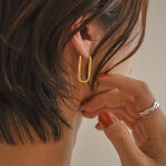 他のサイトで気になっていましたが、いざ購入もいう時にSOLD OUTで血眼になって探したらOIOIにありました! シルバーとゴールドで迷い、両方購入。シルバーが特に欲しいと思っていたけど地味顔な私には物足りない感じですが、これはこれで気分で使い分けようと思います。女性らしいというより男っぽいハンサムなモード感を感じるデザインです。とてもカッコ良くて気に入りました。別ブランドやメーカーで類似デザインの商品が多くありますが、こちらのサイズより縦が短め横が長めのサイズで、パーツの断面が、こちらは四角で他は丸。似てるようで全然雰囲気が違うようです。