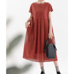 とっても可愛いワンピースです フレンチ袖はやや長めで二の腕が目立たないようなデザインになってます 色は赤というよりも えんじ色です 品があり 夏らしいワンピース の印象です ありがとうございました