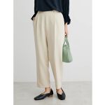 ストレートで柔らかい素材で履きやすいです。股上が深めなので安心感があります。くるぶし丈、タックもありゆとりがあります。ジャストサイズで購入しても大丈夫だと思います。