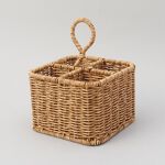 4つに仕切られていてカトラリーごとに分けることができ便利です。しっかりしたお作りで変なガタつきもなく、安定感があります。持ち手がついているので持ち運びも楽々!!見た目はナチュラルなのに、素材はポリプロピレン等の洗える素材なのでその点も嬉しい!!