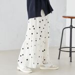 可愛いです。透け感のある生地の上に、ベルベット調の水玉の組み合わせが何とも可愛い。ウエストはゴムで、ヒップ下、裾に向かって、ふっくらしたり、つぼまったりの段々になっているのが、若干太って見える懸念もありつつ、生地の可愛さが勝ってる