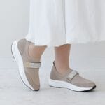 足がむくみやすいのでワンサイズアップを買い、履いた感じが少し緩いかなと思いましたがマジックテープのベルトで調節出来たのでちょうどよく履けました。重さも軽量だと思います。