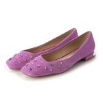 使い回しやすいベージュと迷いましたが、やはりビジューがカラフルなパープルに決めました。幅広でヒールも低めで柔らかめの靴なので、履きやすいです。