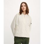 真っ白ではなく着色味がかかったアイボリーのよう。袖の長さはやや長め(中指の第一関節付近)着丈は腰骨下。左の内側にチャック付きポケットあり。右側は仕切りありのポケット。小物くらいは入れられる。XSでもかなりゆったり。横幅広め。シャカシャカいう素材でちょっとレインウェアっぽいが、春先や梅雨の季節に活躍しそう。素材が好みではなかったので星4