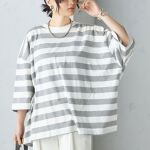 生地はかなり薄めで、相当ゆったりサイズです。横幅がかなり広く、XLサイズの人でも着用可能なサイズ感です。生地が柔らかいのでカーディガンを重ねてもゴワゴワしません。縫い目のボーダー柄はきちんと合わせて縫われていますので、格安・大量販売の服に見るような柄がずれた縫い目ではありません。
