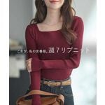 ジャケットのインナーにちょうどいいです?ピタッとフィットしています。結構ピチピチしてしまったので、これ一枚で歩くのは少し勇気がいりますが、ジャケットを羽織れば問題ないです。首周りが開いている服が好きで、こちらの服は大きめに開いていて好みです。