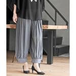 写真で見るより裾がすぼまってる感じでした。ウエストサイズは LやLLを履く私でもゆったりでした