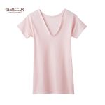 写真より少し黄色みが強いです。生地はちょうどいい厚みです。襟ぐりが深い服だと見えてしまうかも。