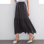形はウエストのギャザーの下がのっぺりストレートで裾の方だけまたギャザーフレアが入っているのでお腹がぽっこりしていると目立ってしまうかもしれません