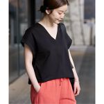 骨格ストレートに適したハリ感とVネックの開き加減で、スタイル良く見せてくれます。