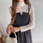 骨格ウェーブで低身長です。ハリ感のある生地なので着られてる感がでないか心配でしたが、何とか大丈夫でした。胸元の切り替えと後ろの紐の交差がかわいいです