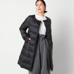 膝下の丈なのに300g台の重さはなかなかありません。子供を抱っこしても快適に動けます。またノーカラーの形なのでなのでタートルネックやマフラーと合わせてもとても可愛いです。ネイビーの色も黒よりも重くなりすぎず上品な色合いです。このコートの短い丈のバージョンも購入したいです。