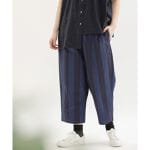 ウエストはギャザーでヒモ仕様ながら、見た目がダボっと、ゆるっとしておらず、生地がかっちりというか、スタイルが崩れません。シワにもなりにくく、きちんと感があり、ダークな縦ボーダー柄もスッキリしたクールにイメージにしてくれます。トップスを選ばない多様性も有りです。