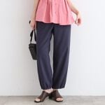 見た目のシルエットは上品ですがゴムウエスト、ドローコードなど末端はカジュアルという不思議なパンツです。