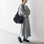 この手のワンピースはどうしても部屋着感が出てしまうのですが、こちらのワンピースは襟元のデザインとお腹のポケットがポイントになっていて部屋着感は薄いかなと思います。