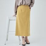 少し厚みがありストレッチがきいた生地で、ぽっこりお腹の体形でもすっきりはけました。ナロースカートですが伸縮性があるので履きやすいし動きやすいです。唯一残念だったのは、色味がオレンジ系のマスタードイエローを期待していたのですが、実物は和がらしに近い暗めのマスタードイエローでした。