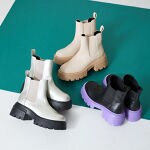厚底の履きやすいゴアブーツが欲しくて見つけていたら、黒と紫のバイカラーのこれに出逢い、一目惚れで即購入。デザインはもちろんのこと、口コミの通り、実際、履きやすいです。長時間履いていても脚首のところで締まるので、靴擦れするところも無く、履き心地は抜群です。形もきれいでとにかくバイカラーがカッコいいです。普段のサイズと同じで大丈夫だと思います。スカートにもパンツにも合います。シルバー×黒も購入しました。