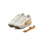 ナイロンのオフホワイト生地に ライトグレーのボワボワっとした荒い質感のスエードのレイアウト、イエローオーカーのピューマのラインがアクセントで入っています。
