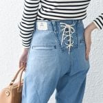 画像は後ろ姿ばかり見ていて、ウエストがスナップボタンということに試着してびっくり。ゆとりのあるサイズを選んだので問題はなかったです。ハイウエストで脚長効果ありです。