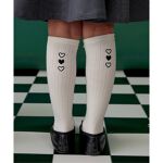 白のハイソックスが必要で、107センチの子供に購入。履くと膝上までありますが、少したるませてハイソックスとして履けます。履いた時のバックプリントのハートがかわいく、シンプルな白ソックスですが、このハートのおかげで娘も気に入って履いてくれたので良かったです。生地は少し薄めかもしれません。