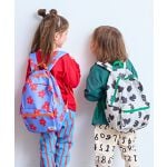 4歳の娘にMサイズを購入しました。全体が濃いピンクでハートが沢山で可愛くて、娘もお気に入りです。保育園用に購入しましたが、荷物がたくさん入ります。少し薄めな生地ですが、値段がお手頃なので許容範囲かなと思ってます。なかなか被らないデザインで目立つので、オリジナル感があって気に入りました!!