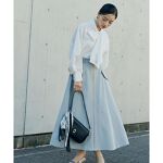 公式アプリでショップスタッフさんの着用画像を見て思っている以上にかわいい!と思いベージュを購入致しました。ハイウエストでとてもスタイルアップします。裾に向かってのラインがとてもキレイです。数日前、別のブランドのフレアスカートを購入した時は箱から出したらシワシワの状態でしたが、このスカートは値段の違いもあり見栄えもまったく違います。安っぽく見えないところがさすがプロポです。ちょっと高かったたのですが満足のお買い物です。