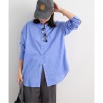 写真で見るよりかなり発色の良いブルーです。オーバーサイズ過ぎず、柔らかい生地なので、インナーにも着られます。
