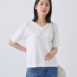 vネックが首元をスッキリと見せてくれます。カットソーより軽く着ていてラクなのにキチンと感があります。