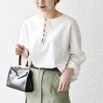 レースアップの紐で襟元の開き具合が調節できて可愛いです!伸縮性があるので着心地も良い!色違いも欲しくなりました。