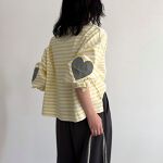 ハートのパッチが見える後ろ姿がかわいいです。また、丈感も短めなので、スカートとの相性も良さそうです。