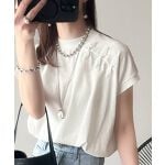7号サイズでSサイズ購入。腕の部分だけモデルの方に用な余裕はあまりありませんでしたが全体的には上半身に十分な余裕のあるデザインでした。首周りは少し厚めの仕上がりですが生地の厚さは丁度よかったです。シンプルですが、チャイナボタン風の刺繍が立体でアクセントになっていてなかなか見ないデザインでよかったです。