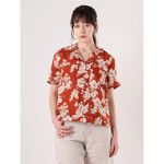 デザインは、写真画像で見るより赤みが無く、落ち着いた色味のアロハシャツですね。