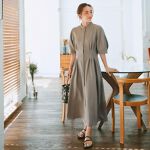 ネイビーを注文して気に入ったのでブラウンも追加購入しました。二の腕や肘も隠れ、首回りはバンドカラーでスッキリ!ぽっこり下腹も絶妙なふんわり縫製で目立たず◎、あえて言うならウエストの後ろのスカートが膨らみ過ぎるのでこの部分は少しスッキリしたデザインだと良かったなと思いました。
