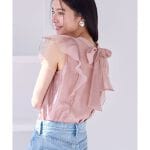リボンがアクセントになっていて、くすみピンクでかわいいです。生地は光沢感と透け感があり、立体的な感じなので、パンツにもスカートにもジャケットの中に着ても良いと思います。袖は短めです。