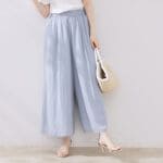 グレージュを普段のサイズで購入。真夏にも使えるさらっとした素材に透けにくい裏地つきなので淡色にしました。落ち着いたライトグレーのような色合いで合わせやすそう。丈は裾を踏みたくないのでウエストを一折りすると良い感じでした。
