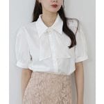生地に艶があって品の良い感じ。サイズ感もちょうどよい。程よい透け感も素敵です。シフォンのボウタイがかわいい。ボウタイは、襟元についているパール飾りの輪に通して簡単に着脱できます。