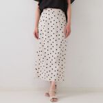 グレーに水玉はカジュアル過ぎず、トップスに黒を合わせるとエレガントに着こなしができると思います。色あいは予想通りです。サイズはMだと少しウエストが大きいですが、インして履くといい感じです。