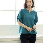 薄めの生地で涼しい、グリーンが明るすぎず着やすいです。一枚でキレイに見えるので使いやすいです。
