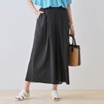 とてもハリのあるシャリ感の強い素材です。でも薄いのでガサガサすることなく、サラッと着られます。ブラックですが、スミクロという感じのお色で重たすぎずいい感じの色合いです。もう9月ですがまだまだ暑さが続きそうなので秋らしくなるまで着られそう。上の方だけ裏地があるのも安心感があって有り難いです。丈はやや長めですが、シャリ感のある素材のおかげで足元にまとわりつく感じがなく足さばきが良いです。しかしインディヴィはLとLLの差が大きいのでいつもサイズに悩みますね。